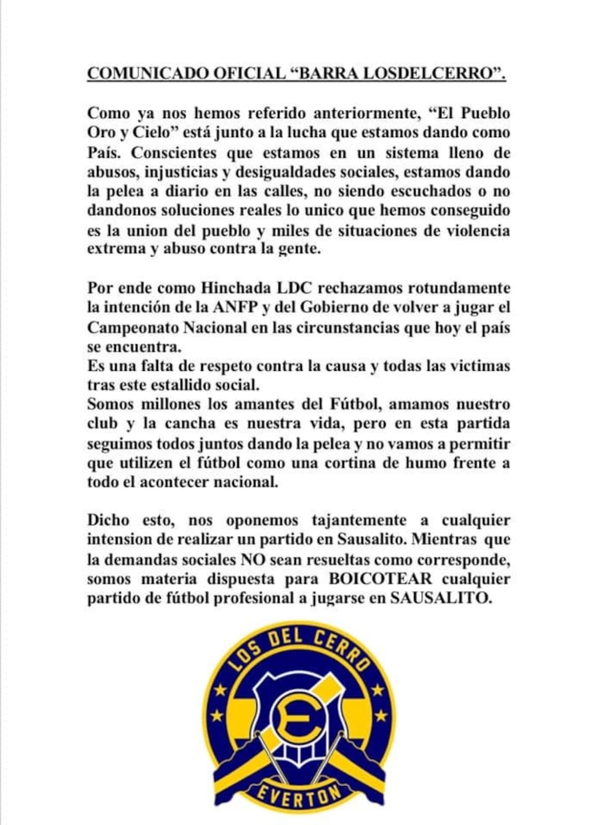 La publicación indica que “como Hinchada Los Del Cerro, rechazamos rotundamente la intención de la ANFP y del Gobierno de volver a jugar el Campeonato Nacional en las circunstancias que hoy el país se encuentra”.