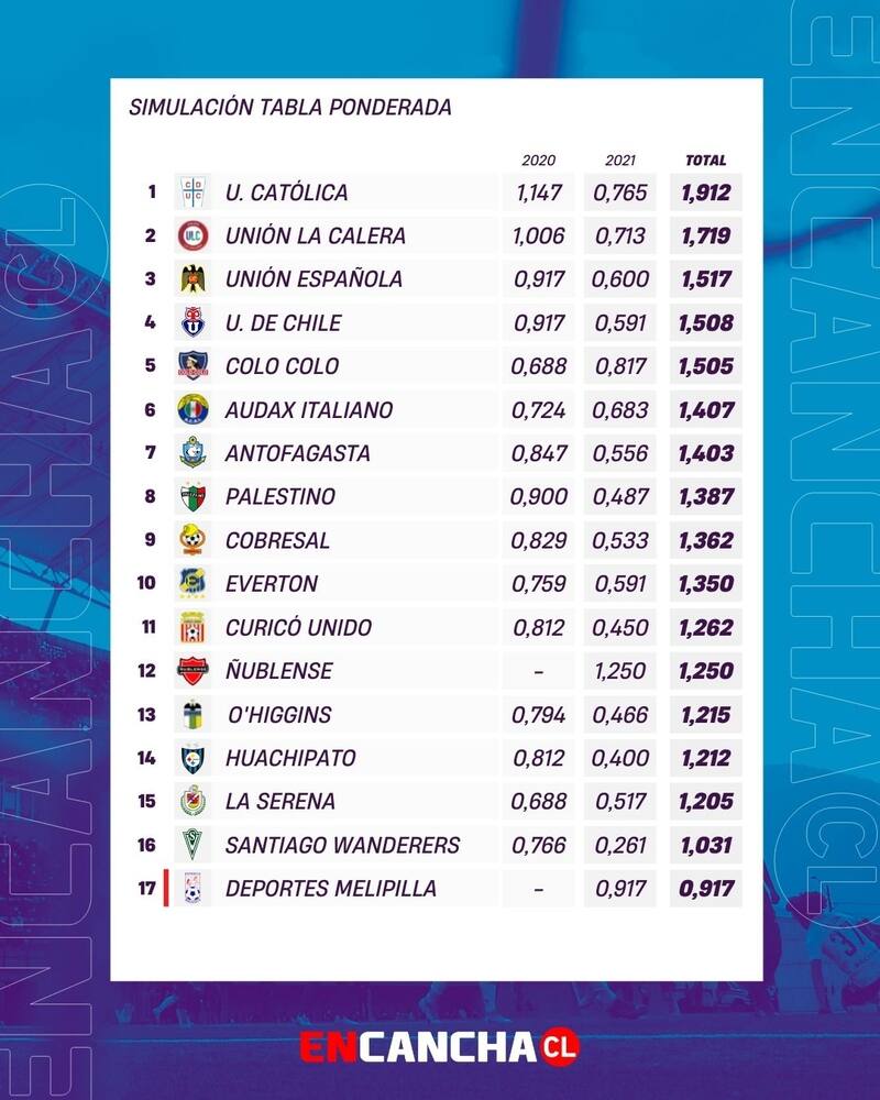 Un puesto más arriba aparece Santiago Wanderers, quienes se verían castigados por su magra campaña en este 2021 y presentan un puntaje ponderado de 1,037. Mientras que los "Papayeros" quedan en zona de promoción con un 1,205, muy cerca de Huachipato (1,212) y O'Higgins (1,215).