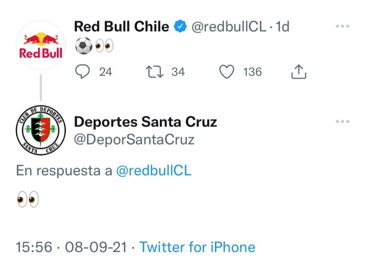Y pronto podrían unirse nuevos clubes a esta franquicia, incluso algún chileno tendría opciones. Esto porque Deportes Santa Cruz "coqueteó" con la filial de la bebida energética en Chile, cruzando emoticones en un hilo de Twitter.