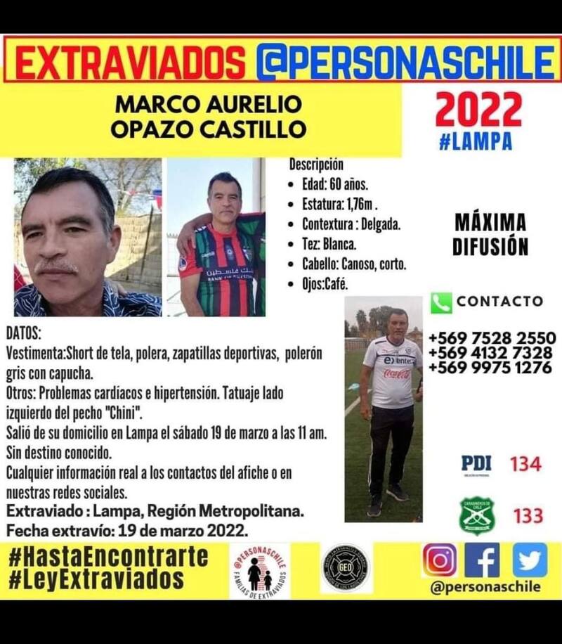 En redes sociales se puede encontrar el afiche que han compartido sus familiares, en el cual está la descripción física de cómo se encuentra hoy quien vistió la camiseta de Palestino entre 1982 y 1989. Si se posee información sobre el paradero de Marco Opazo Castillo puede hacerla llegar a los números de teléfono +56 97528 2250, +56 94132 7328 y +56 99975 1275.