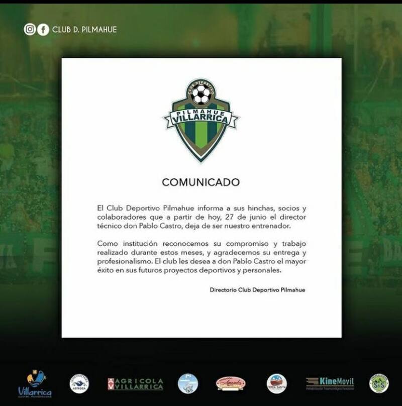 A través de redes sociales, Pilmahue lanzó un comunicado donde anuncian la salida del entrenador y agradecen todo el compromiso y trabajo que el técnico realizó durante su estadía en el equipo sureño. En las respuestas a la publicación en redes sociales, fueron varios los hinchas que se mostraron agradecidos con Pablo Castro a pesar de no haber conseguido los resultados esperados.
