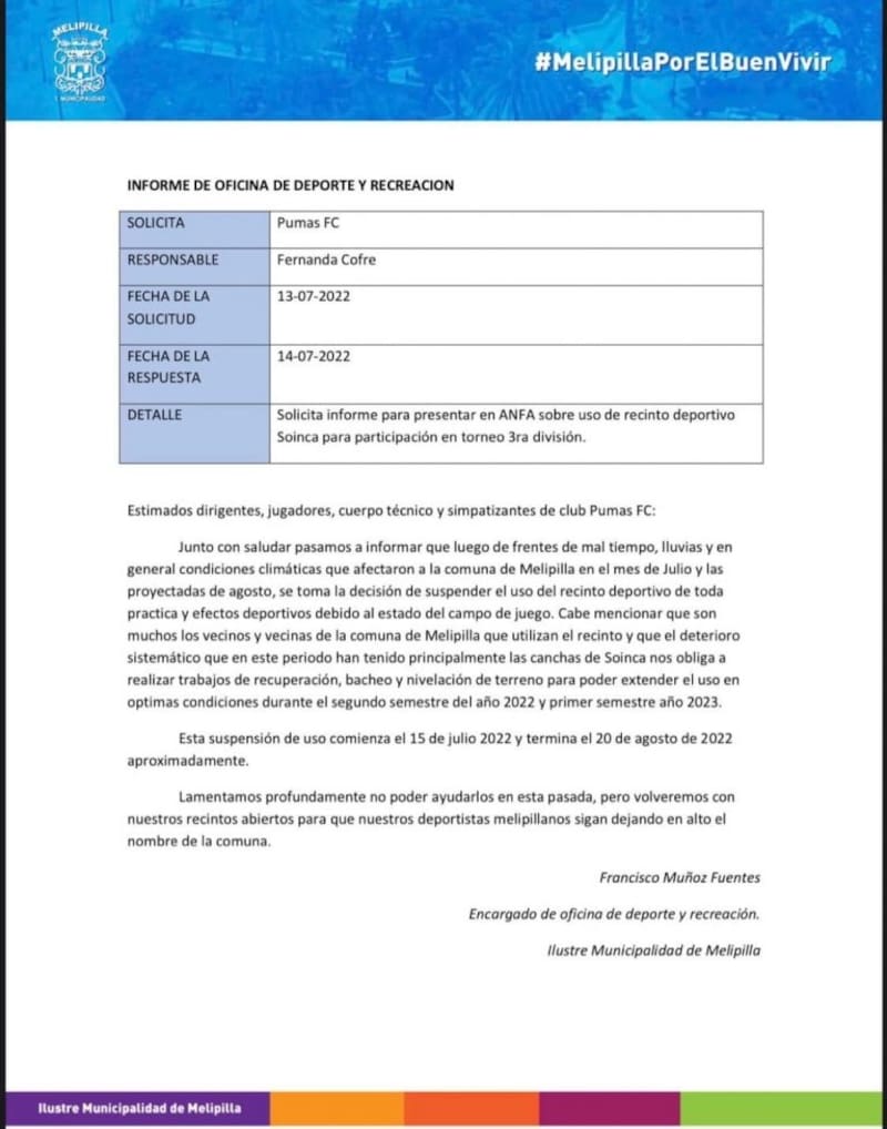 "Lamentablemente no podremos jugar por razones climatológicas y tampoco reprogramar el proximo dia miércoles 20 nuestro partido que se jugaría este día sábado 16 de julio en el Estadio Soinca Bata. Con esta decisión de nuestro municipio, quedamos expuestos primero a perder los puntos por no presentacion y, a la vez, al borde de la expulsión del torneo por faltar a las bases del Campeonato Oficial", publicó Pumas en sus redes sociales.