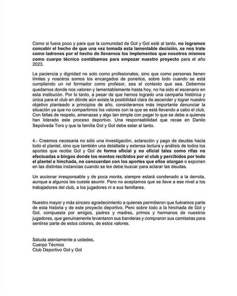 En un extenso comunicado público replicado en las redes sociales de los profesionales, el ahora renunciado staff técnico dispara directamente contra los dirigentes. “Una campaña que se ve mermada por acciones ajenas a lo deportivo, marcadas por un mal manejo y pésimo trato de quienes administran esta institución. Un accionar irresponsable y negligente que perjudica los más de 60 años de historia de este club”, alega el escrito.