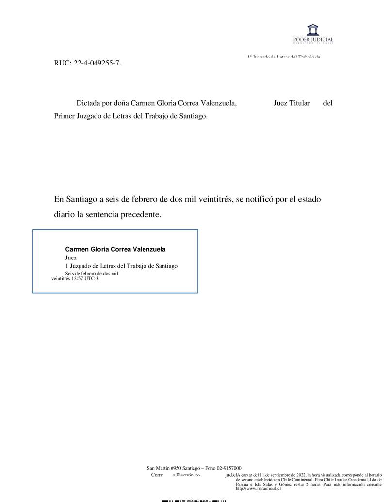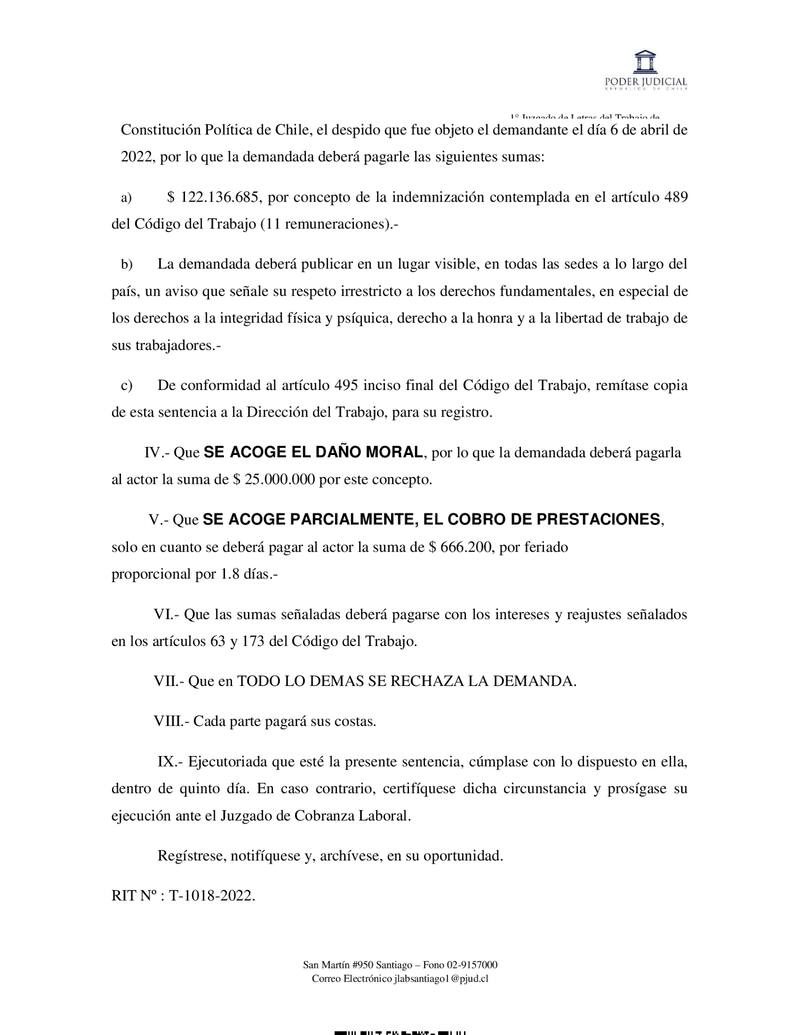 "Se rechaza la excepción de finiquito, se acoge la demanda por despido injustificado y vulneración de derechos fundamentales. Se acoge la demanda por daño moral", sostiene el escrito dictado por Carmen Gloria Correa Valenzuela, Juez Titular del Primer Juzgado de Letras del Trabajo de Santiago.