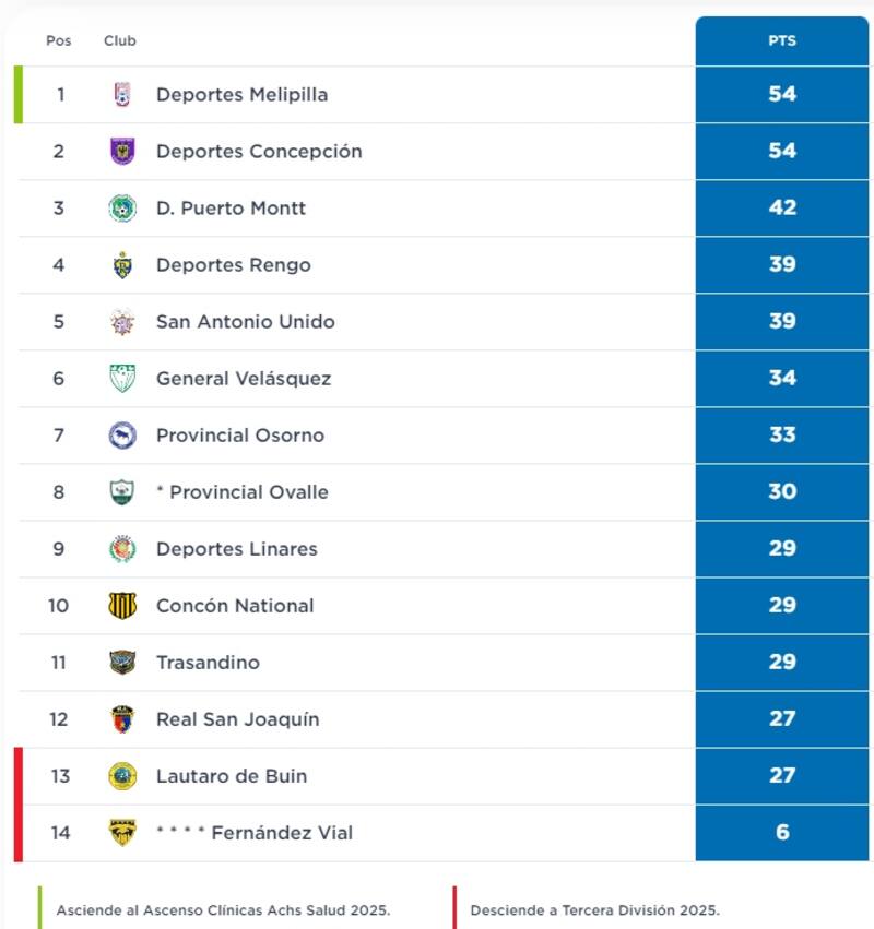 Horas más tarde, el Conce hizo su tarea y venció por 2-1 a General Velásquez y trepó a la cima del torneo, quedando con los mismos puntos de Melipilla. Por su parte Concón National cerró la jornada 25 de Segunda División con un triunfo trascendental sobre Lautaro de Buin, pues con el resultado de 2-0 los hunde a la zona roja y los conconinos se alejan del descenso.
