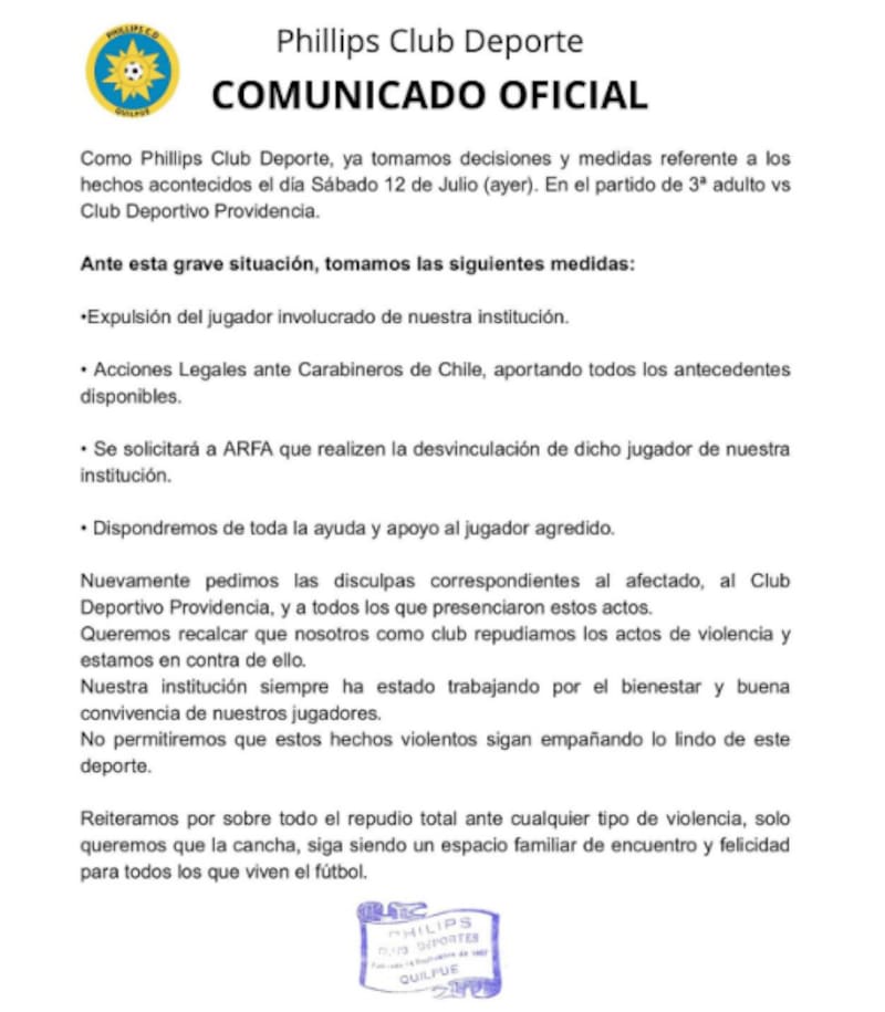 Horas después de los hechos, el Club Deportivo Phillips anunció la “expulsión del involucrado de nuestra institución”, “Acciones legales ante Carabineros de Chile, aportando todos los antecedentes disponibles” y, adicionalmente, “dispondremos de toda ayuda y apoyo al jugador agredido”.