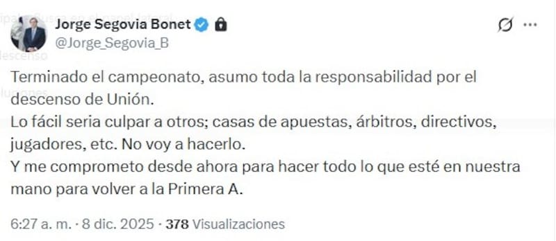 Pero así nomás es. Y mientras los lamentos rojos siguen latentes, faltaba la palabra de quien no por pocos es apuntado como el principal responsable de la debacle: el dueño del club, Jorge Segovia.