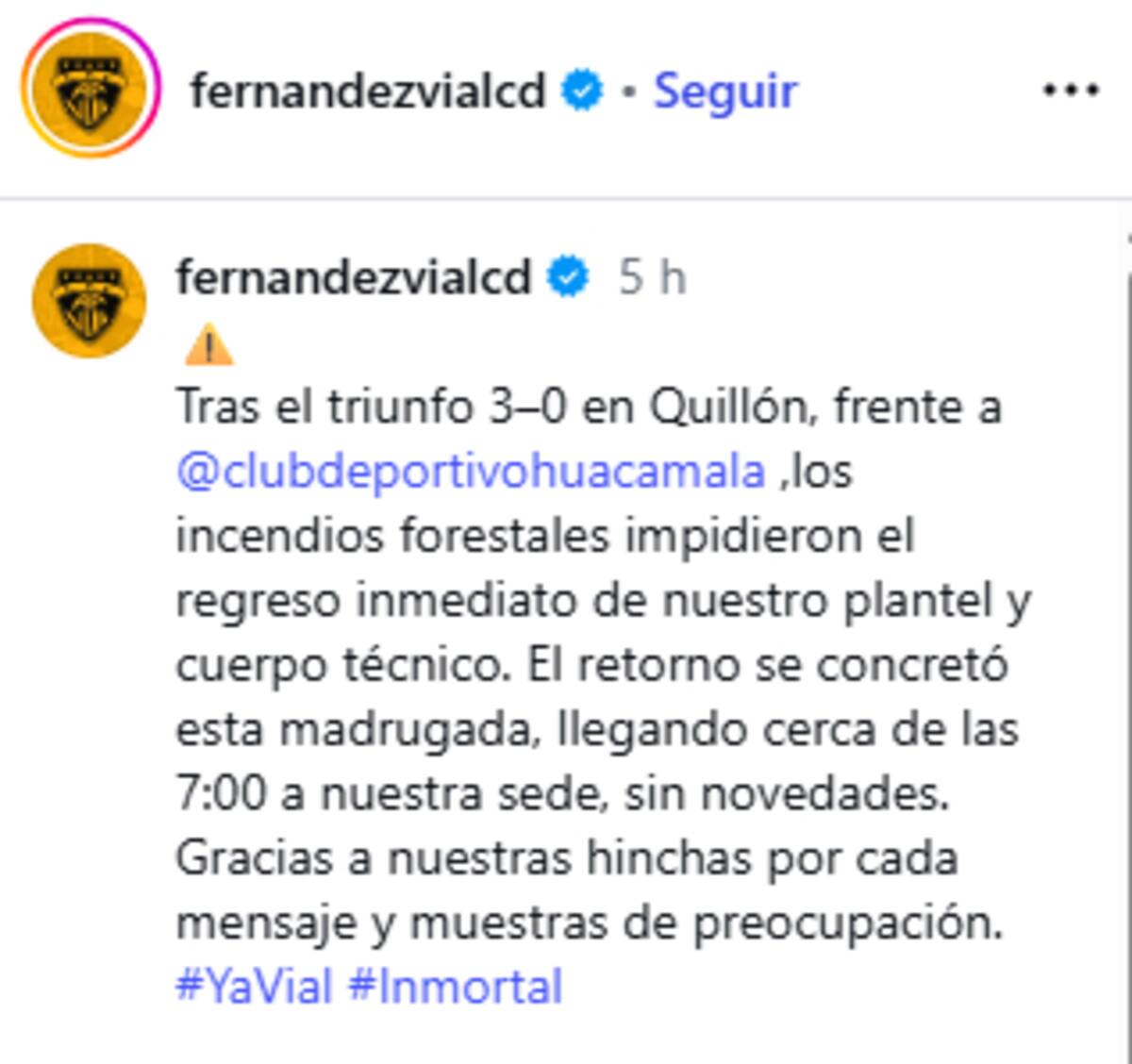 El partido que debían disputar hoy Universidad de Chile y Racing de Argentina fue suspendido, por ejemplo. Pero no es el único plan futbolístico que se vio alterado por la emergencia, ya que un club histórico de la zona, Fernández Vial, también vivió horas de incertidumbre por los incendios.