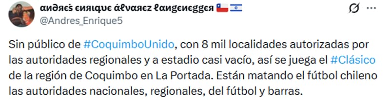 Algo que se tomó las redes sociales. Y aunque algunos hinchas de Coquimbo aprovecharon de “termear” sobre la poca convocatoria de los Papayeros, la mayoría simplemente lamentó, con mezcla de pena y rabia, cómo uno de los partidos más destacados de la fecha, y una de las mayores rivalidades del fútbol chileno, no pudo tener un marco de público acorde a la ocasión.