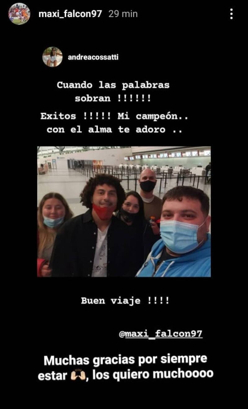 Durante esta tarde, el nuevo refuerzo de Colo Colo, Maximiliano Falcón, compartió en sus historias de Instagram una postal junto a sus cercanos, quienes lo estaban despidiendo en el aeropuerto, antes de tomar su vuelo a Chile.