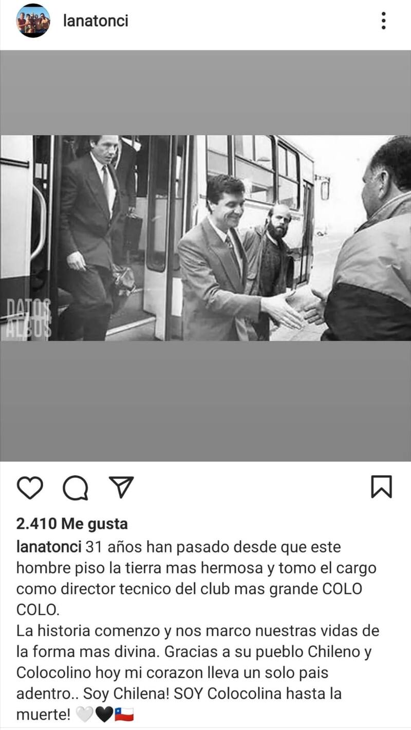 "31 años han pasado desde que este hombre pisó la tierra más hermosa y tomó cargo como director técnico del club más grande Colo Colo", inició Lana Jozic en una publicación en su cuenta de Instagram.