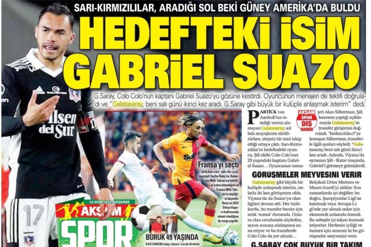 Estas palabras llegaron rápidamente a Turquía. El medio Aksam Spor le dedicó una plana completa a las palabras del agente del formado en Macul, que reveló un interés del grande del fútbol turco, pero sin aún una oferta oficial. "Nombre del objetivo: Gabriel Suazo", titularon.