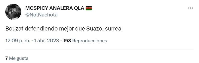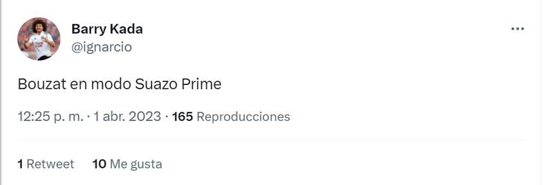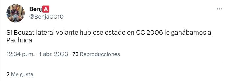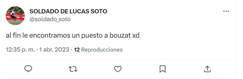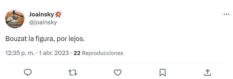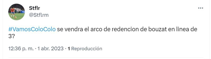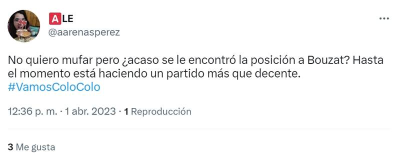 A través de Twitter, los fanáticos albos aplaudieron el nivel de Bouzat. Luego de ser utilizado como volante durante 2022, el trasandino fue utilizado como lateral-volante por izquierda y dejó buena impresión marcando a Brayan Palmezano, una de las figuras más importantes de Huachipato.