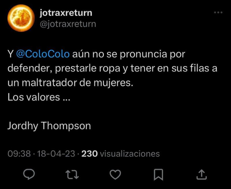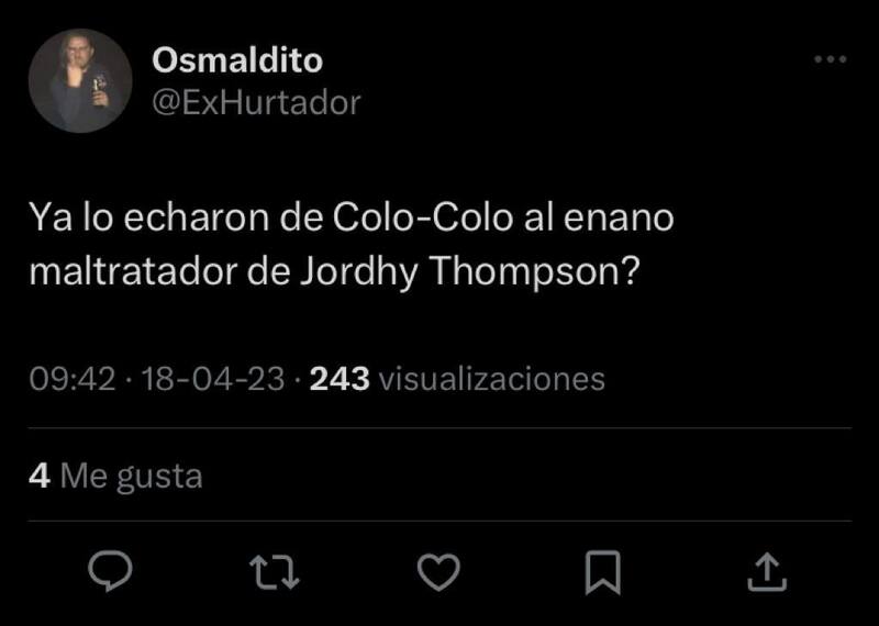 “¿Qué está esperando Colo Colo para echar a Jordhy Thompson”, “Jordhy Thompson no puede seguir en Colo Colo” y “Jordhy Thompson debería ser desvinculado de Colo Colo”, fueron algunos de los comentarios.