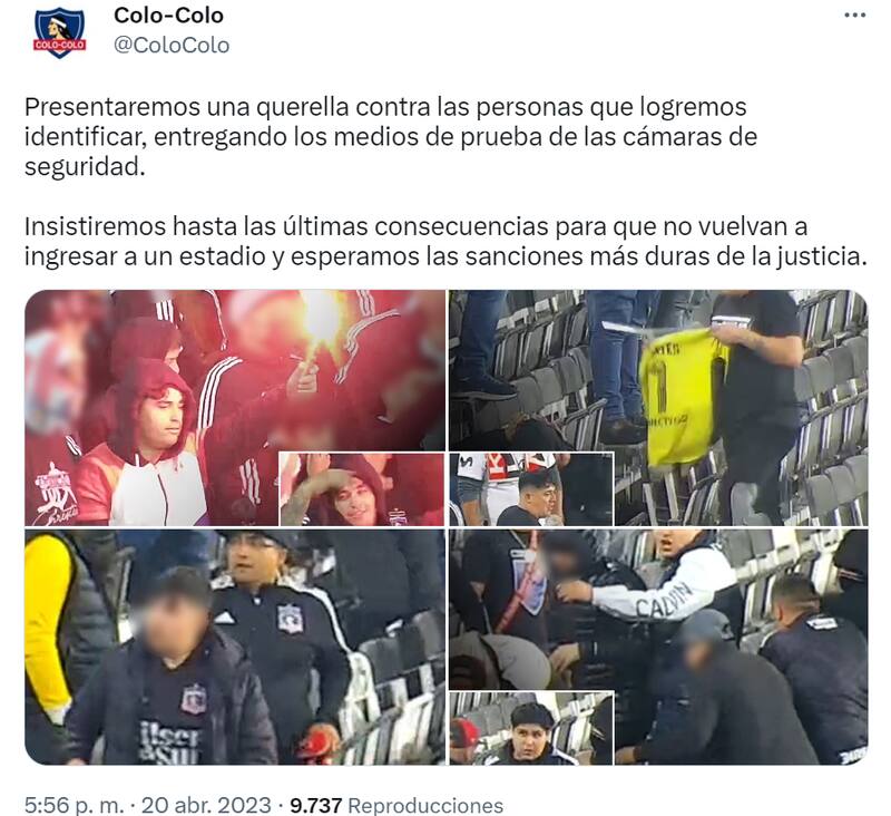 “¡Estos no son hinchas! Ni de Colo-Colo ni del fútbol. Trabajamos junto a las autoridades para individualizar e identificar a los sujetos que persisten en perjudicar al club y la localía. A los identificados se le aplicará código 102 con prohibición de ingreso al estadio”, comentaron.