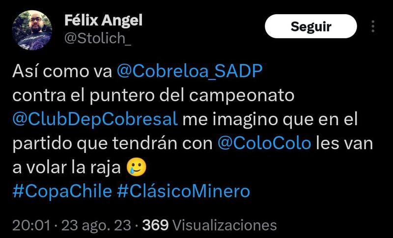 Luego de asegurar su paso en la Copa Chile Cobreloa publicó en sus redes sociales el marcador con el que le ganaron a Cobresal, aprovechando de anunciar al próximo rival. Y fue ahí en donde la parcialidad loína aprovechó para comenzar a calentar el duelo frente a Colo Colo.