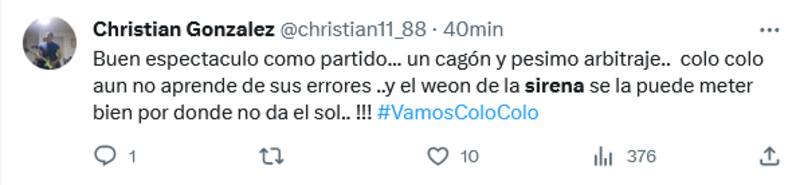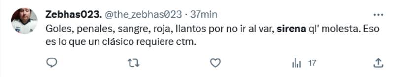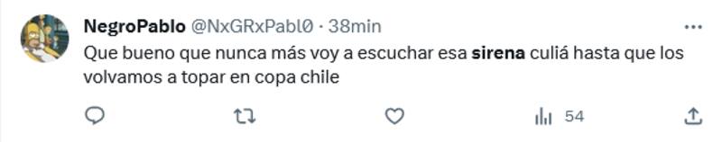 “Qué alivio no escuchar más esa sirena”, “Qué bueno que nunca más voy a tener que escuchar esa sirena hasta que los volvamos a topar en Copa Chile”, “Hijo, córtela con la sirena”, fueron parte de los comentarios.