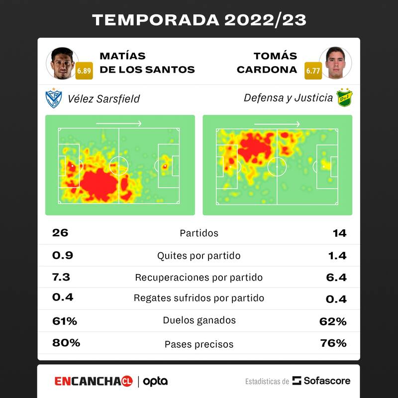 Comparando sus estadísticas en la temporada 2022/2023, el que mejor llega es Matías De los Santos, ya que viene con mucho más juego que Tomas Cardona. En cuanto a las estadísticas, el uruguayo destaca por su buen juego con los pies, logrando un 80% de pases precisos.