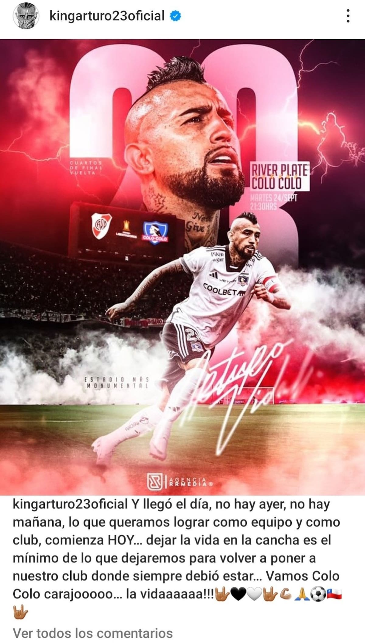 “Y llegó el día, no hay ayer, no hay mañana, lo que queramos lograr como equipo y como club, comienza HOY... dejar la vida en la cancha es el mínimo de lo que dejaremos para volver a poner a nuestro club donde siempre debió estar... Vamos Colo Colo carajooooo... la vidaaaaaa!!!”, comentó el Rey.
