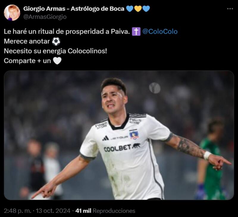 El argentino no dudó y comentó a través de su cuenta de X (anteriormente Twitter), que ayudará a Guillermo Paiva a reencontrarse con el gol en este final de campeonato. “Le haré un ritual de prosperidad a Paiva. Merece anotar. Necesito su energía Colocolinos!”, manifestó Armas.