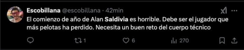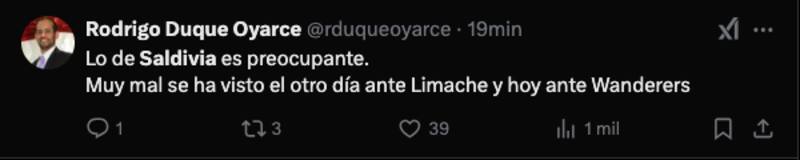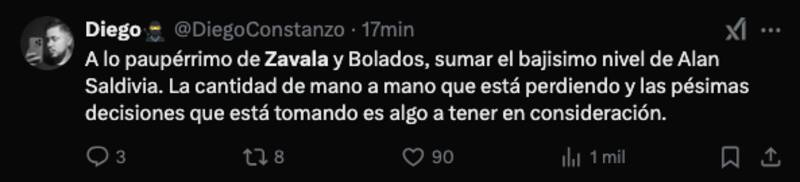 El rendimiento del equipo no fue el mejor y por ello los hinchas criticaron con todo a dos jugadores del plantel por su discreto desempeño. Alan Saldivia y Cristián Zavala fueron los más apuntados por los fanáticos en redes sociales tras la derrota.