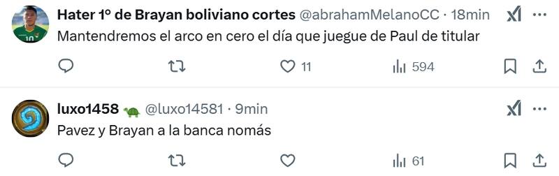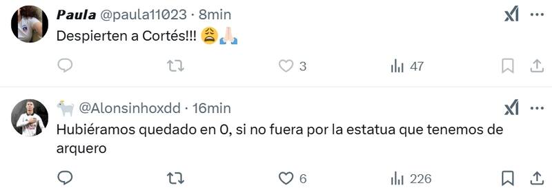 “Nunca se tira”. “Tiene que irse”, “error tras error Brayan Cortés”, “contratamos a una estatua”, son algunos de los comentarios de los internautas en X.