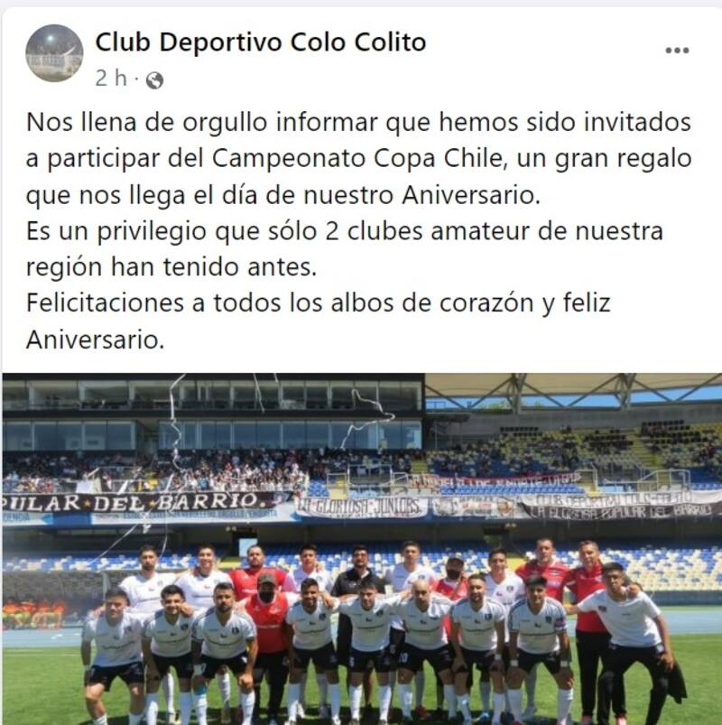 "Nos llena de orgullo informar que hemos sido invitados a participar del Campeonato Copa Chile, un gran regalo que nos llega el día de nuestro Aniversario", indicó la institución en su página de Facebook.