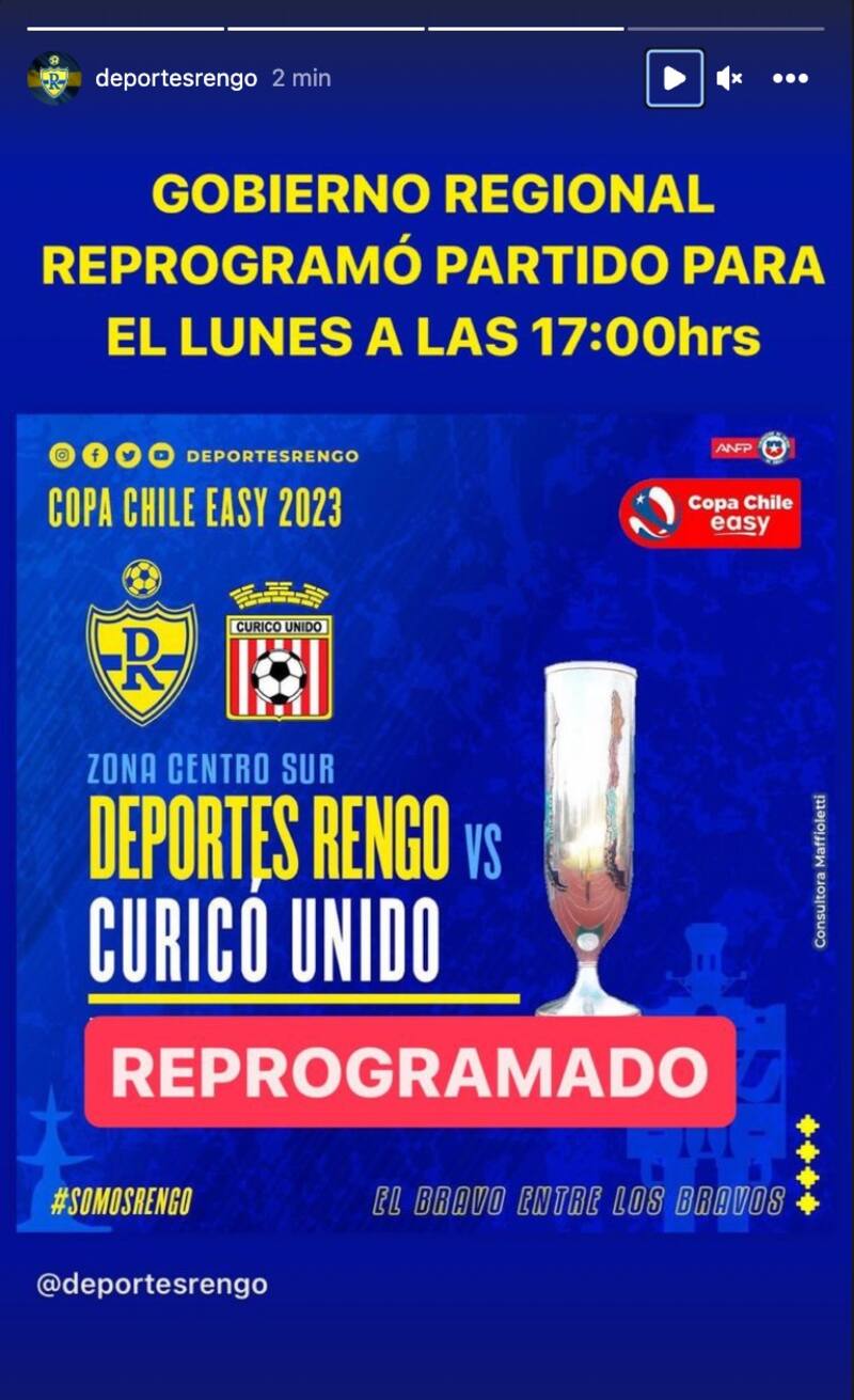 A través de sus plataformas digitales, Deportes Rengo, organizador del duelo por ser el equipo local, anunció la modificación en el programa. Ahora, el partido se jugará en el mismo Estadio Jorge Silva de San Fernando, a partir de las 17 horas de este lunes.