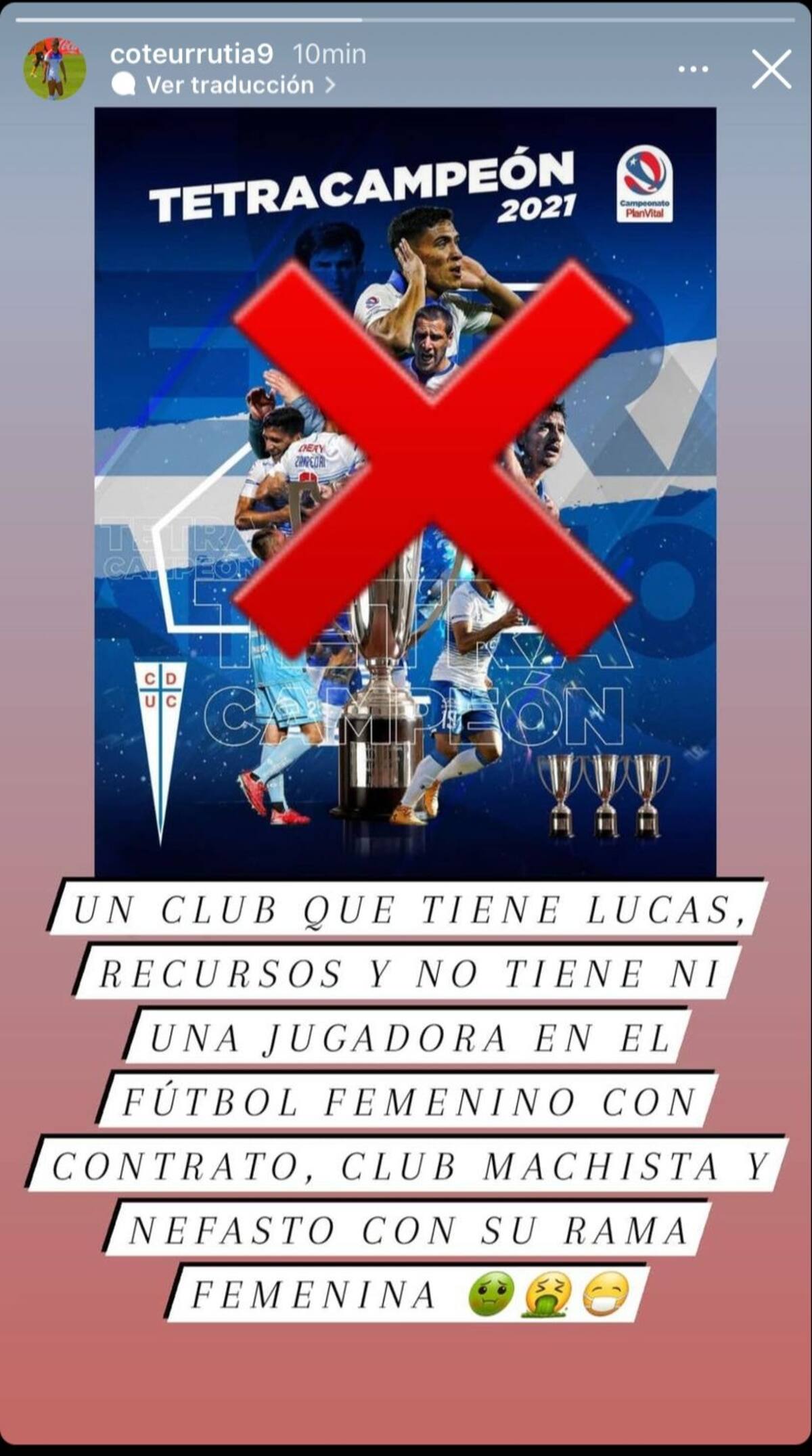 Además, en señal de rechazo, la internacional con La Roja Femenina acompañó el mensaje con una cruz en la publicación de la cuenta oficial del Campeonato Nacional que rezaba la frase de "tetracampeones" con la foto de Marcelino Núñez, mediocampista de la UC.