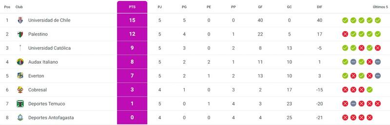 En el Grupo B lidera Universidad de Chile con 15 puntos escoltada por Palestino con 12.