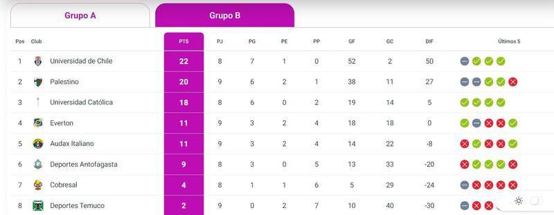 En el grupo B, en tanto, Audax Italiano aprovechó su oportunidad para instalarse en el cuarto puesto e ilusionarse con entrar a los play offs gracias al triunfo por 2-1 sobre Cobresal en el norte, con goles de Sol Morales (43') y Dominique Chamorro (80'). El descuento fue obra de Nicole Lazo (13').