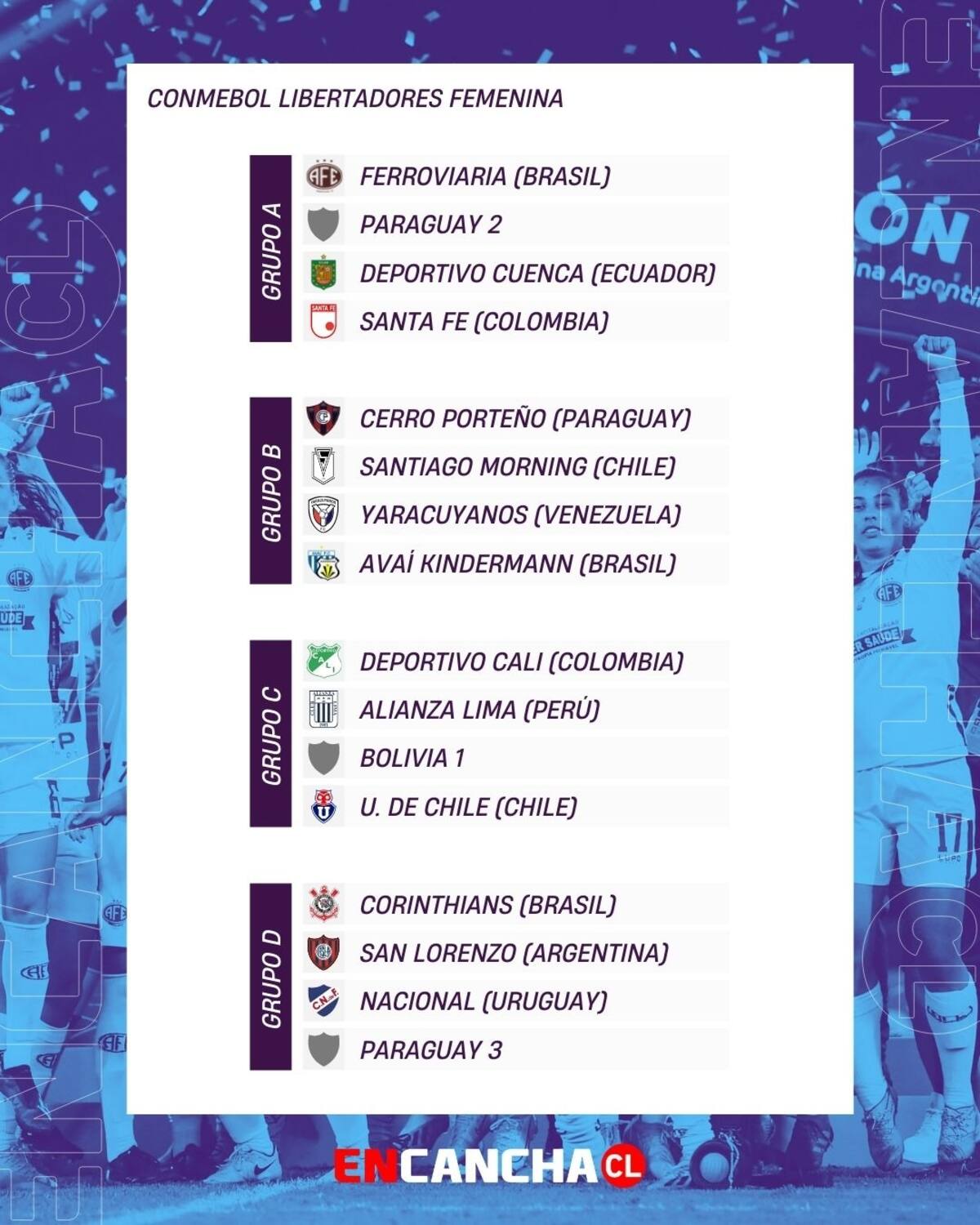 En el sorteo, realizado este viernes por la Conmebol, se determinó los equipos que acompañarán al conjunto "Microbusero" y a las azules en esta edición de Copa Libertadores. El "Chago" participará del grupo B junto a Cerro Porteño (Paraguay), Yaracuyanos (Venezuela) y Avaí Kindermann (Brasil), mientras que Universidad de Chile se medirá en el grupo C junto a Deportivo Cali (Colombia), Alianza Lima (Perú) y el cupo que aún no se define de Bolivia 1.