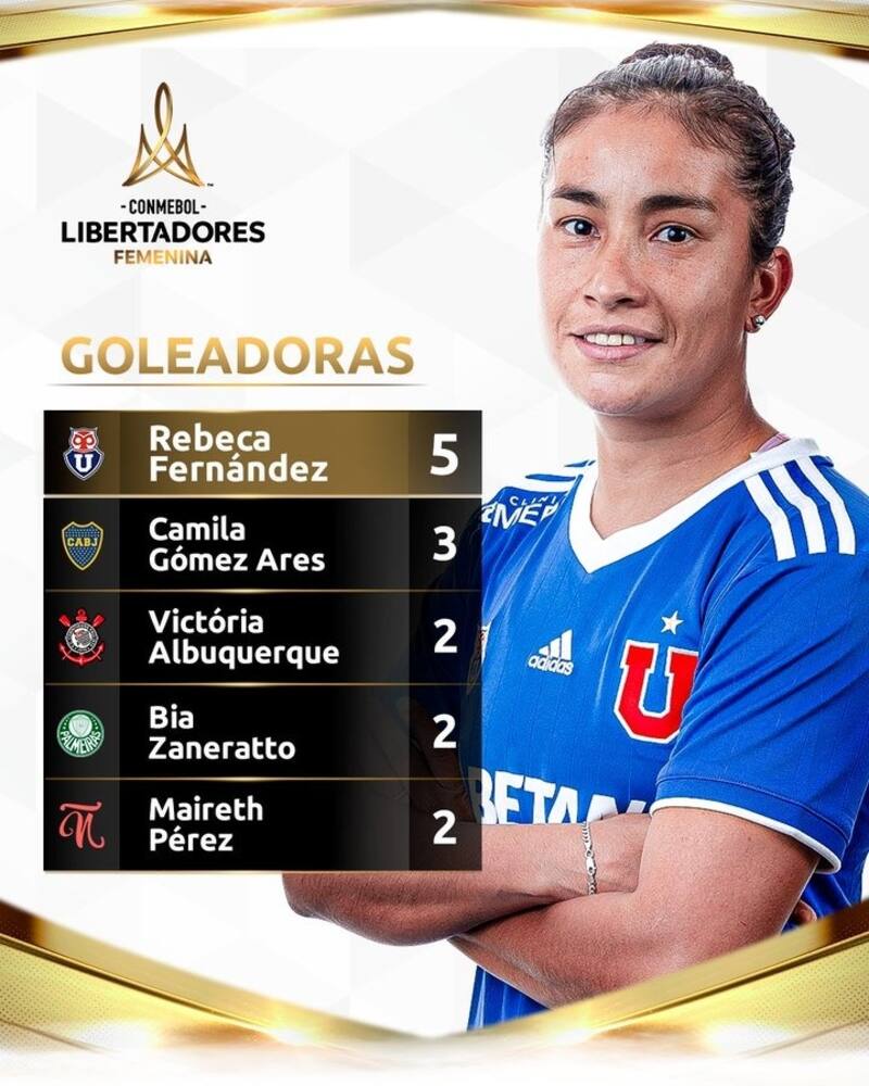 Rebeca Fernández suma cinco goles en la actual Copa Libertadores en tan solo dos partidos, un increíble registro que supera a las goleadoras del torneo en 2021. Tatiana Ariza, Linda Caicedo, Esperanza Pizarro, Jheniffer y Victória fueron las máximas anotadoras de la edición pasada con cuatro goles, un registro que la delantera de la U ya superó.
