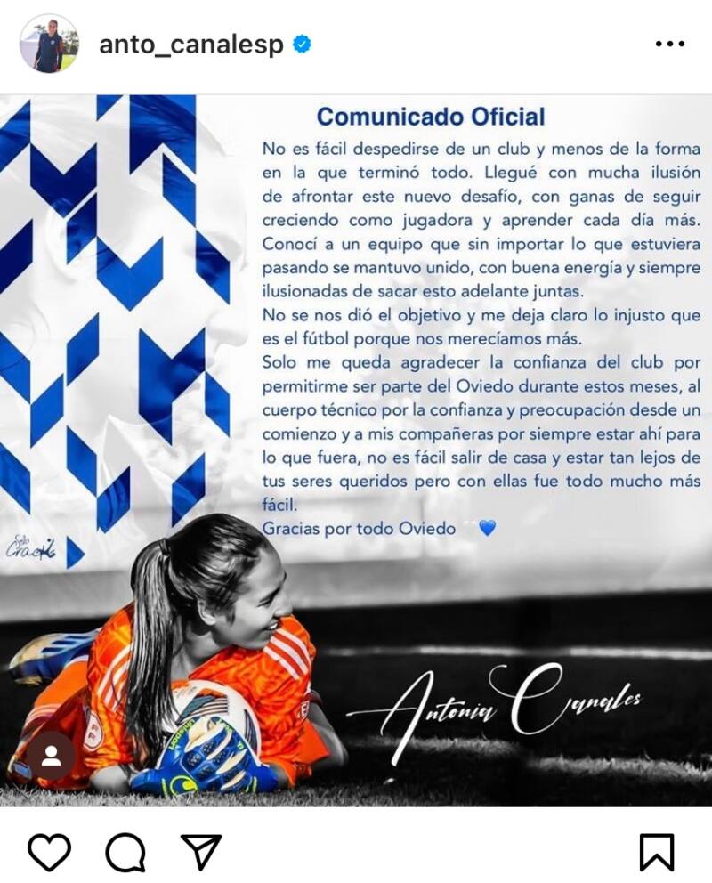 La futbolista, quien fue titular en el duelo del pasado domingo ante Brasil en Brasilia con la Roja Femenina, agradeció al club por estos seis meses. “Gracias por todo, Oviedo”, concluyó.