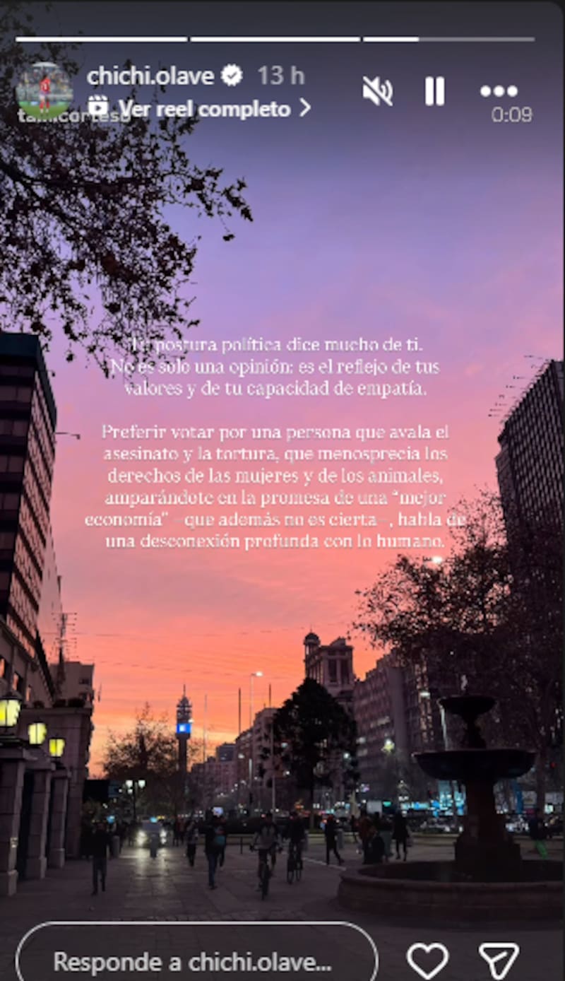 Michelle Olivares Acevedo e Isidora Olave compartieron una publicación en que apuntan a discrepancias valóricas con el Republicano. “Preferir votar por una persona que avala la tortura y el asesinato, que menosprecia los derechos de las mujeres y los animales, amparándote en la promesa de ‘una mejor economía’ -que además no es cierta- habla de una desconexión profunda con lo humano”, versa el texto exhibido por las futbolistas.