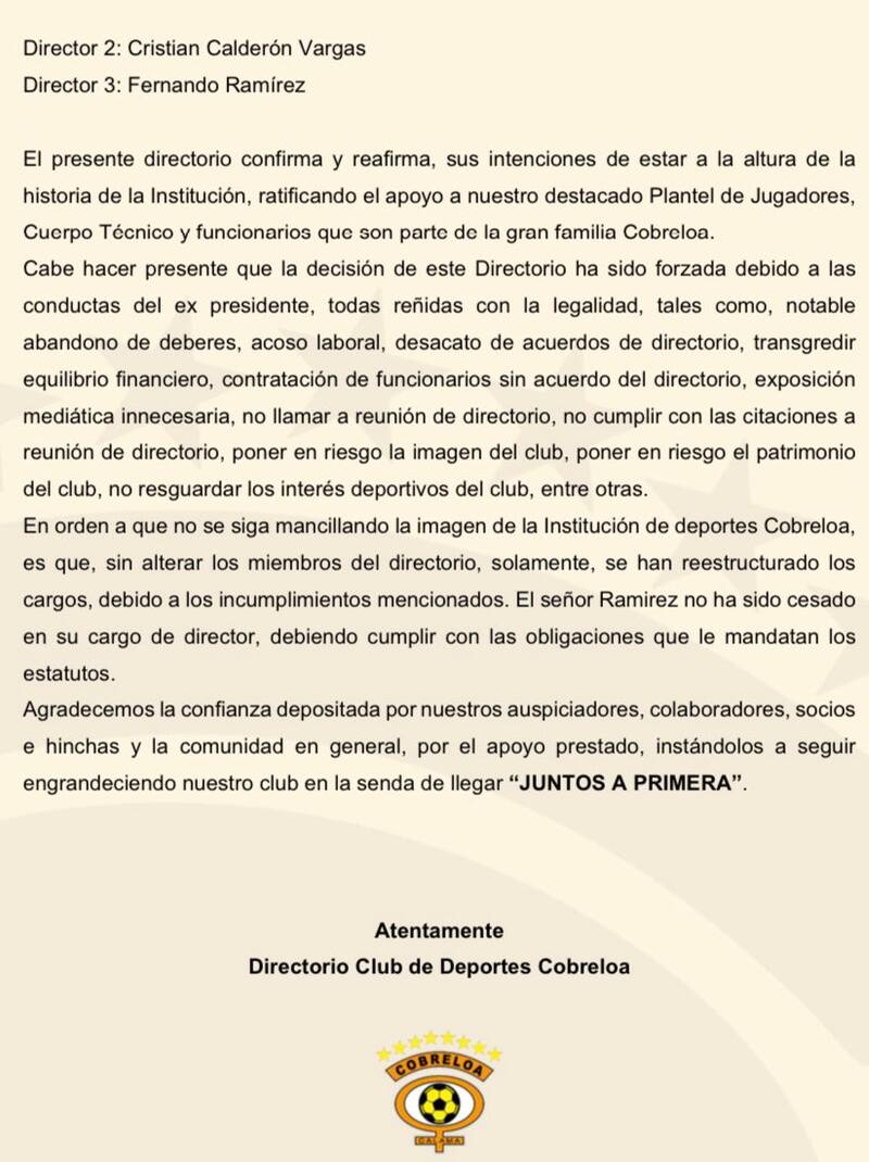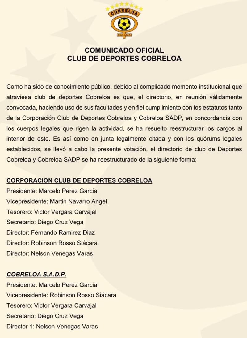 “Como ha sido de conocimiento público, debido al complicado momento institucional que atraviesa club de deportes Cobreloa es que, el directorio, en reunión válidamente convocada, haciendo uso de sus facultades y en fiel cumplimiento con los estatutos tanto de la Corporación Club de Deportes Cobreloa y Cobreloa SADP, en concordancia con los cuerpos legales que rigen la actividad, se ha resuelto reestructurar los cargos al interior de este” informó el club en un comunicado de prensa.