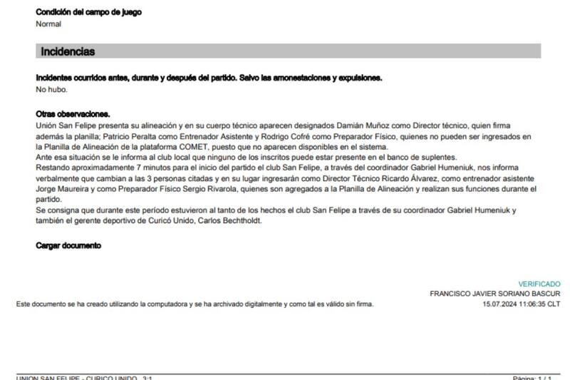¿Por qué Unión San Felipe podría ser castigado, entonces? Según consta en el informe del árbitro del partido ante Curicó, Francisco Soriano, el conjunto local presentó en la planilla oficial a su nuevo entrenador, Damián Muñoz, junto a sus asistentes Patricio Peralta y Rodrigo Cofré (PF).