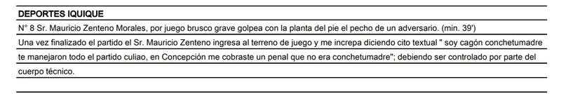 "Una vez finalizado el partido, el sr. Mauricio Zenteno ingresa al terreno de juego y me increpa diciendo, cito textual, "soy cagón conche..., te manejaron todo el partido cu... En Concepción me cobraste un penal que no era, conche...", indicó Deischer.