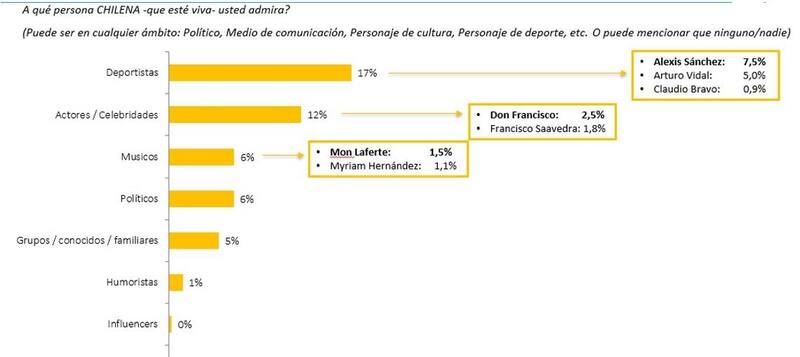 A su vez, las personas chilenas que más admiran los migrantes son deportistas. Alexis Sánchez es el más idolatrado por los extranjeros en Chile con un 7,5% de los votos, seguido de Arturo Vidal con un 5,0% y Claudio Bravo con un 0,9%.