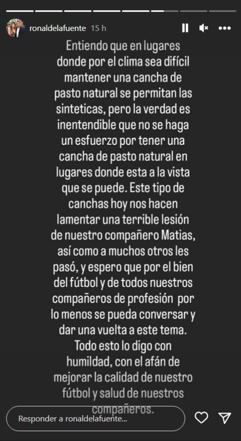 "Es inentendible que no se haga el esfuerzo por tener una cancha de pasto natural en lugares donde esta a la vista que se puede. Este tipo de canchas nos hacen lamentar hoy la lesión de nuestro compañero Matías, así como a muchos otros les pasó, y espero que por el bien del fútbol y de todos nuestros compañeros de profesión, por lo menos se pueda conversar y dar una vuelta a este tema", comentó en su cuenta de instagram.