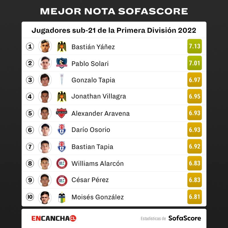 Según el listado elaborado por SofaScore, Bastián Yáñez se alza como el jugador joven con mejor rendimiento en lo que va de torneo, con una nota de 7,13. En tanto, Pablo Solari, que en esta jornada fue presentado en River Plate, ocupa el segundo puesto con una evaluación de 7,01, mientras que Gonzalo Tapia de la Universidad Católica cierra el podio con 6,97.