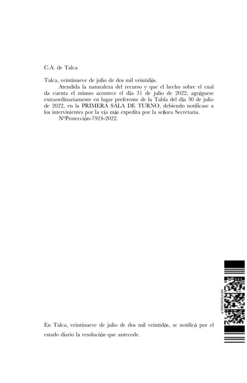 "Atendida la naturaleza del recurso, y que el hecho sobre el cual da cuenta el mismo acontece el día 31 de julio de 2022, agréguese extraordinariamente en lugar preferente de la Tabla del día 30 de julio de 2022, en la Primera Sala de turno, debiendo notificarse a los intervinientes por la vía más expedita por la señora Secretaria", fue el documento que envió esta jornada la Corte de Apelaciones de Talca.