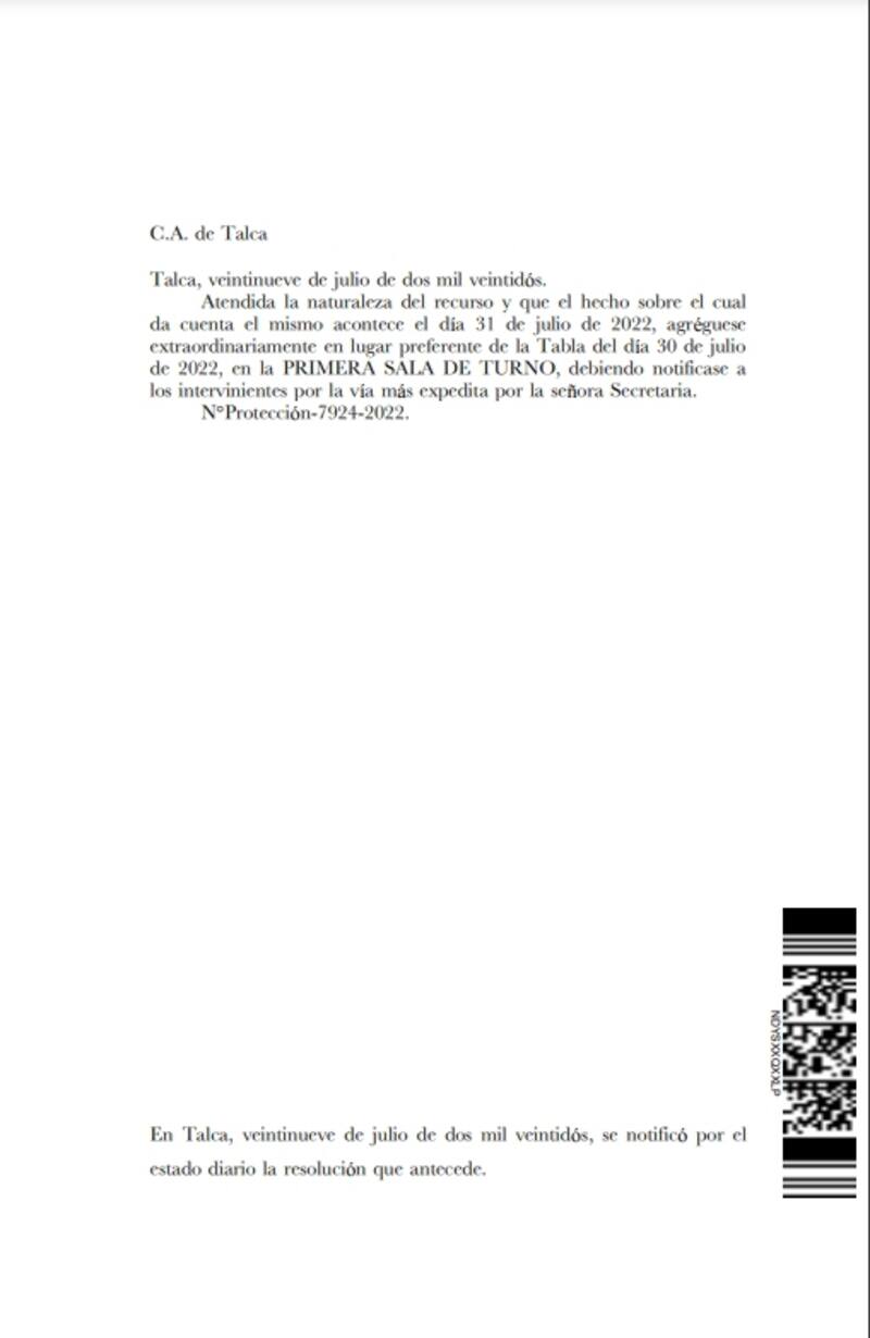 "Atendida la naturaleza del recurso y que el hecho sobre el cual da cuenta el mismo acontece el día 31 de julio de 2022, agréguese extraordinariamente en lugar preferente de la Tabla del día 30 de julio de 2022, en la PRIMERA SALA DE TURNO, debiendo notificase a los intervinientes por la vía más expedita por la señora Secretaria" detalló el mandato.