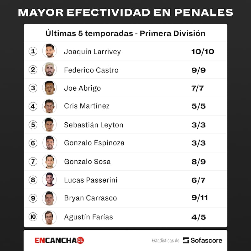 El listado de las últimas cinco temporadas elaborado por Sofascore y que mide solamente los datos del Campeonato Nacional es encabezado por Joaquín Larrivey -hoy en el Cosenza-, delantero argentino que vistió la camiseta de la U entre 2020 y 2021, convirtiéndose en goleador de los azules. El "Bati" tuvo la oportunidad de lanzar 10 penales en su etapa en la Universidad de Chile, con un 100% de efectividad.