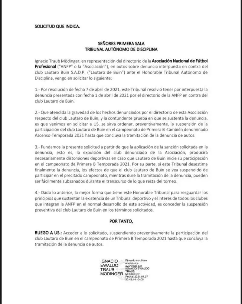 "Que atendida la gravedad de los hechos denunciados por el directorio de esta Asociación respecto del club Lautaro de Buin, y la contundente prueba en que se sustenta la denuncia, es que venimos en solicitar a US. se sirva ordenar, preventivamente, la suspensión de la participación del club Lautaro de Buin en el campeonato de Primera B -también denominado Ascenso- Temporada 2021 hasta que concluya la tramitación de la denuncia de autos", dice parte del comunicado, firmado por Ignacio Traub Mödinger, Secretario Ejecutivo de la Asociación Nacional de Fútbol Profesional.
