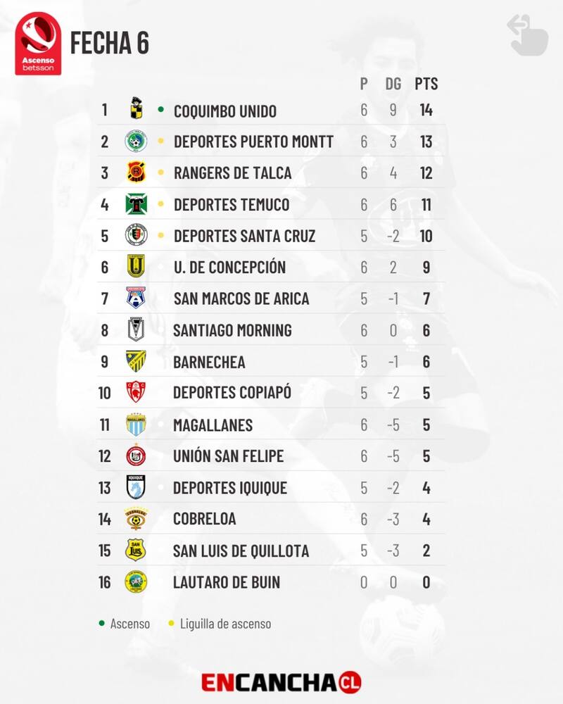 Más tarde, Deportes Temuco se hizo fuerte en el norte y derrotó por 2-1 a San Marcos de Arica y se posicionó como tercero. En tanto, si Coquimbo Unido vence a Deportes Santa Cruz recuperará el liderato.