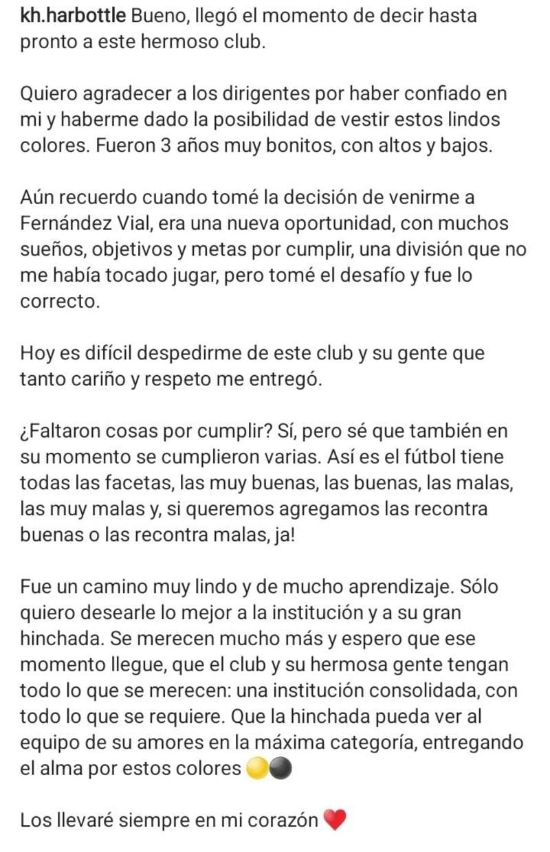 "Aún recuerdo cuando tomé la decisión de venirme a Fernández Vial, era una nueva oportunidad, con muchos sueños, objetivos, y metas por cumplir, una división que no me había tocado jugar, pero tomé el desafío y fue lo correcto. (...) ¿Faltaron cosas por cumplir? Sí, pero sé que también en su momento se cumplieron varias", detalló el mediocampista.