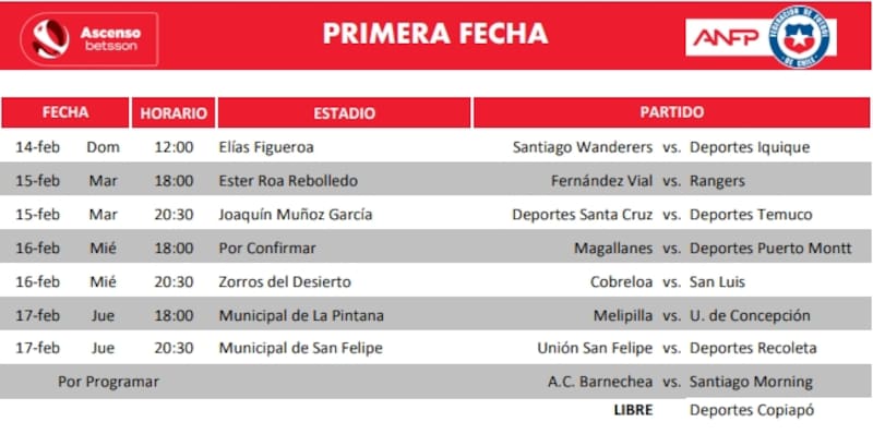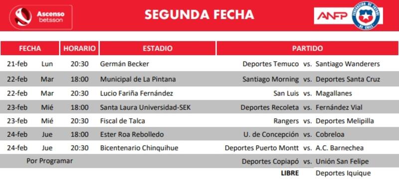 La primera fecha de la Primera B quedó programada entre el domingo 13 y el jueves 17 de febrero, donde Santiago Wanderers y Deportes Iquique abrirán los fuegos en jornada dominical, desde las 12:00 horas, en el Estadio Elías Figueroa Brander de Valparaíso.