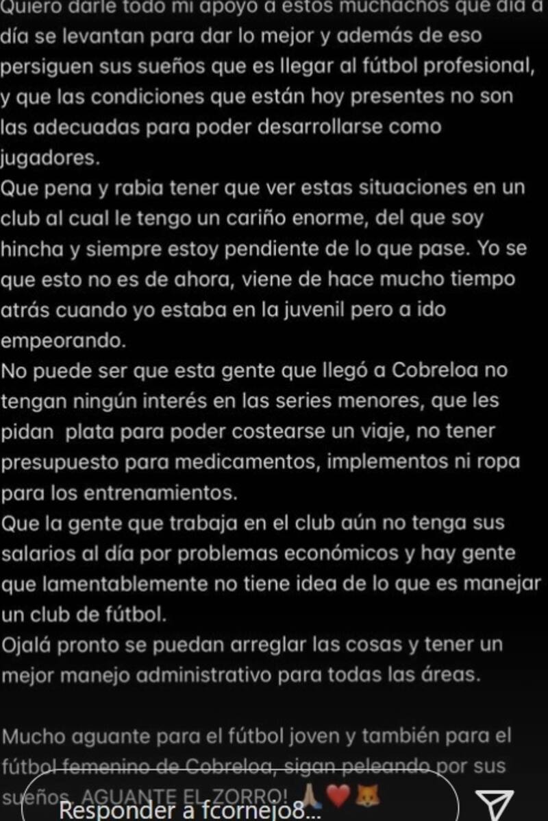 Esta situación, no sólo tiene preocupados a jugadores e hinchas, si no también a futbolistas identificados con el club como Fernando Cornejo, hijo del histórico emblema del club, que a través de una historia de Instagram dejó en claro su desesperación por lo que sucede en inferiores y su esperanza para que todo esto empiece a cambiar.
