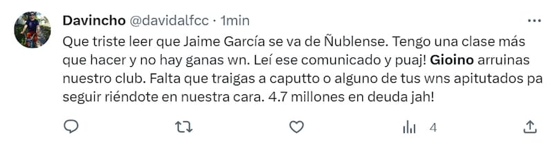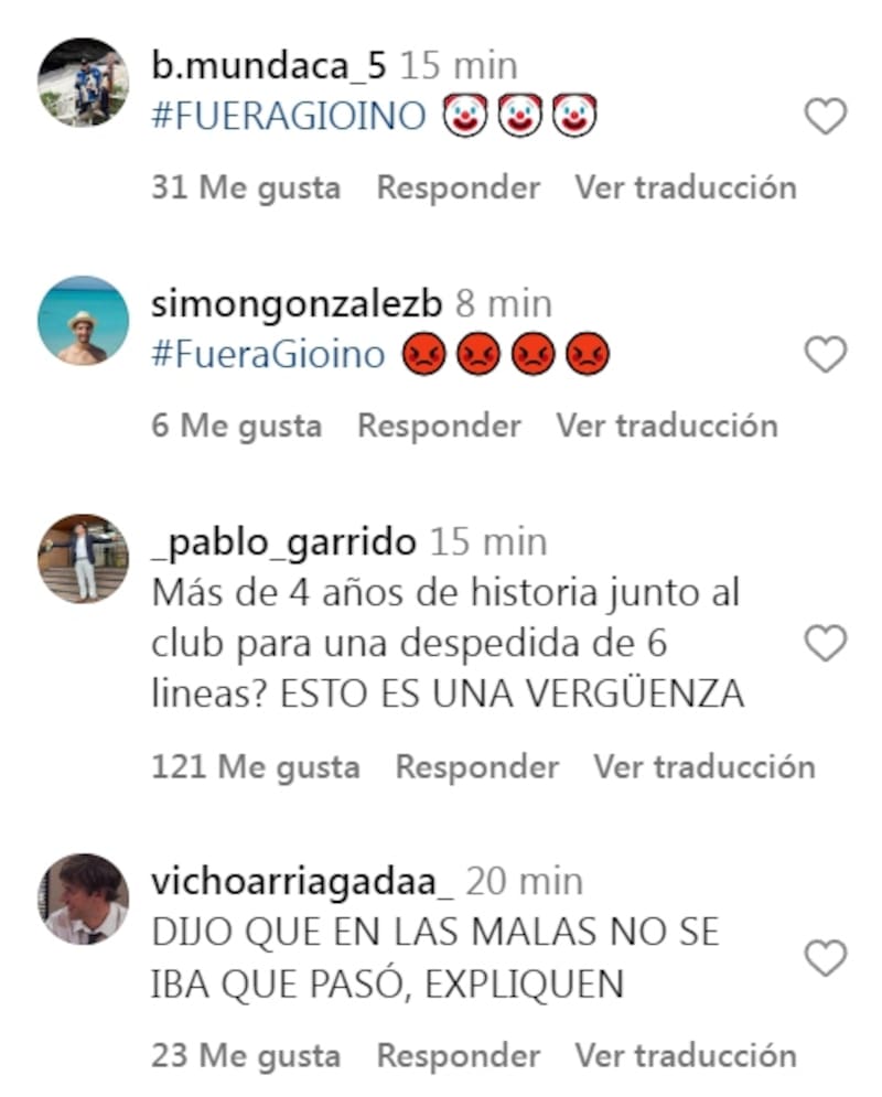 En Instagram los hinchas se manifestaron y trataron de buscar explicaciones inmediatamente, ya que parecía extraño que un día se quiera quedar y al otro termine su vínculo con el club. Es por lo mismo que muchos señalaron a Sergio Gioino como el principal culpable. De hecho, varios han pedido su salida de la dirigencia por este suceso.